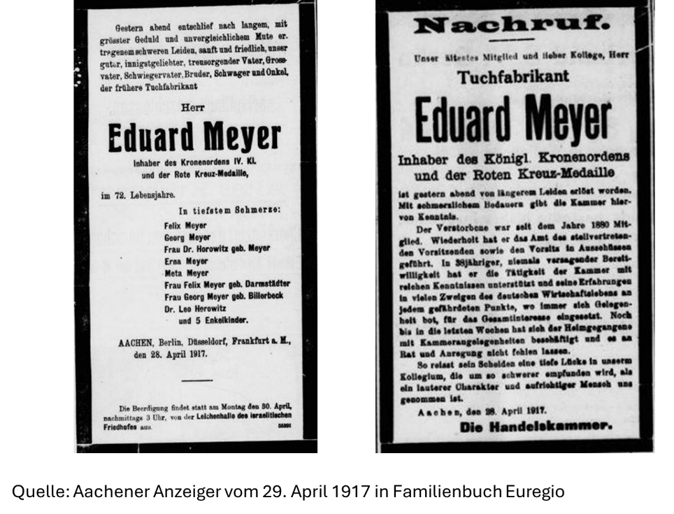 Die Brüder Elias und Moses Moritz Meyer, 1811 bzw. 1815 geboren, stammten aus Freckenhorst bei Münster in Westfalen. Sie werden im Jahr 1843 als Gebrüder Meyer in Aachen erwähnt. Ihr Geschäft wuchs zu einer der erfolgreichen jüdischen Tuchhandlungen. Dass Elias nicht unbedeutend für Aachen war, erkennt man etwa an der Gründung der Stiftungen, die er und seine Frau Friederike anlässlich ihrer Silberhochzeit und ihres Wegzugs aus Aachen gründeten.