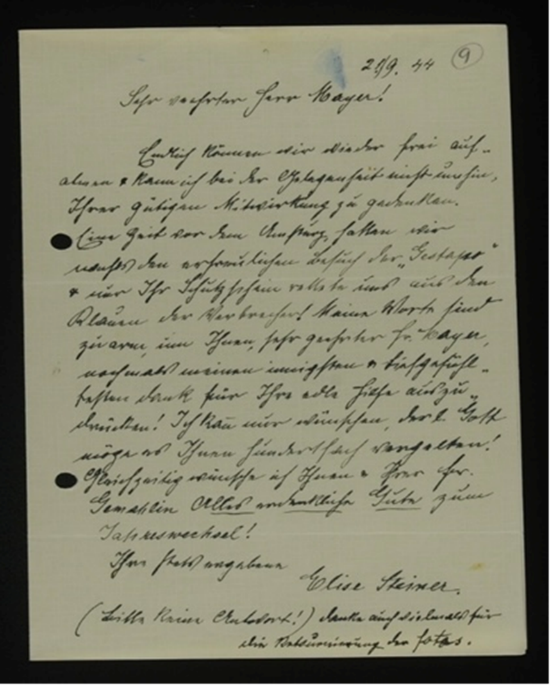 Sehr geehrter Herr Meyer, endlich können wir wieder frei aufatmen und kann ich bei der Gelegenheit nicht umhin, Ihrer gütigen Mitwirkung zu gedenken. Eine Zeit vor dem Umsturz hatten wir den erfreulichen Besuch der Gestapo und nur Ihr Schutzschein rettete uns aus den Klauen der Verbrecher. Meine Worte sind zu arm, um Ihnen, sehr geehrter Herr Meyer, nochmals meinen innigsten und tiefgefühlten Dank für Ihre edle Hilfe auszudrücken. Ich kann nur wünschen, der liebe Gott möge es Ihnen hundertfach vergelten. Gleichzeitig wünsche ich Ihnen und Ihrer Frau Gemahlin alles erdenklich Gute zum Jahreswechsel. Ihre stets ergebene Elise Steiner