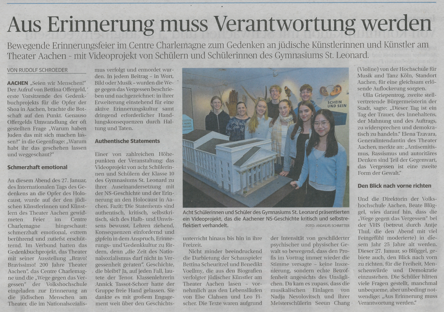 Ulla Griepentrog, zweite stellvertretende Bürgermeisterin der Stadt, sagte: „Dieser Tag ist ein Tag der Trauer, des Innehaltens, der Mahnung und des Auftrags, zu widersprechen und demokratisch zu handeln.“ Elena Tzavara, Generalintendantin des Theater Aachen, merkte an: „Antisemitismus, Rassismus und autoritäres Denken sind Teil der Gegenwart, das Vergessen ist eine zweite Form der Gewalt.“ Und die Direktorin der Volkshochschule Aachen, Beate Blüggel, wies darauf hin, dass die „Wege gegen das Vergessen“ bei der VHS (betreut durch Antje Thul, die den Abend mit viel Feingefühl moderierte) in diesem Jahr 25 Jahre alt werden. Dieser 27. Januar, so Blüggel, gebiete auch, den Blick nach vorn zu richten, für die Freiheit, Menschenwürde und Demokratie einzustehen. Die Schüler hätten viele Fragen gestellt, manchmal unbequeme, aber unbedingt notwendige: „Aus Erinnerung muss Verantwortung werden.“